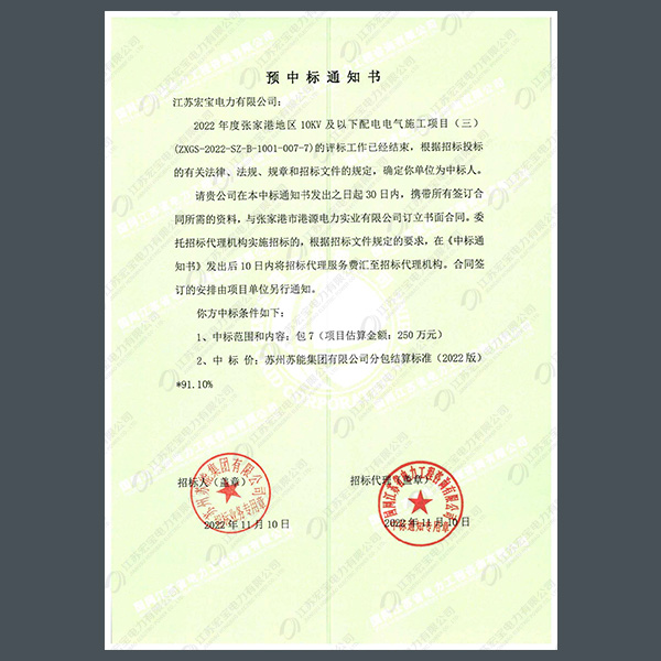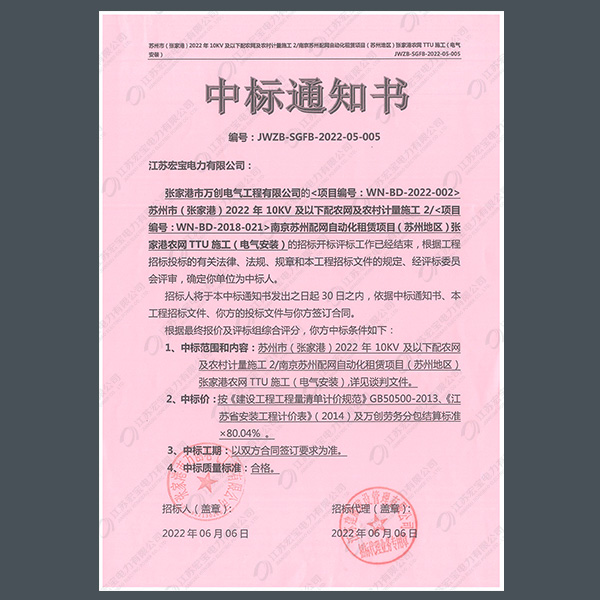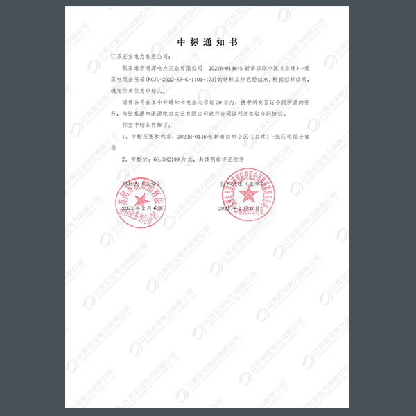 低壓電纜分接箱中標(biāo)通知書
