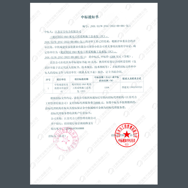 高低壓柜中標(biāo)通知書